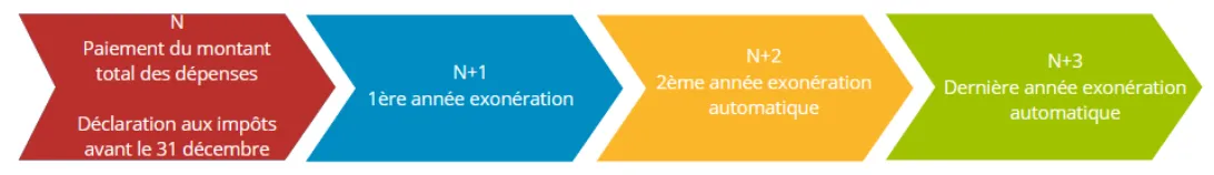 L'exonération de taxes foncières dure 3 ans à compter du 1er janvier qui suit celle du paiement du montant total des dépenses.