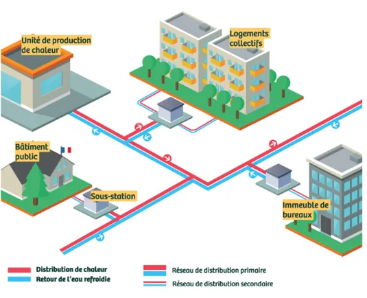 On définit un réseau de chaleur comme une installation distribuant à plusieurs usagers la chaleur produite par une ou plusieurs chaufferies. Cette chaleur distribuée est généralement utilisée pour le chauffage de logements ou bâtiments tertiaires et la production d’eau chaude sanitaire.
