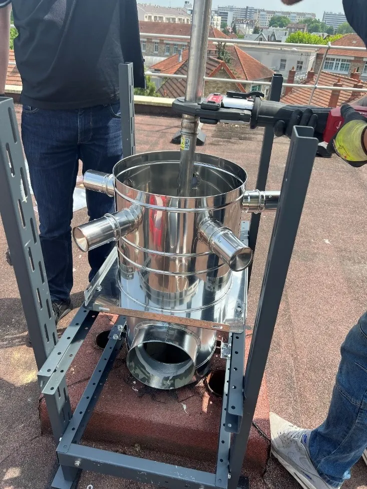 La solution repose sur un système multi-tubage, où la colonne VMC gaz d’origine est maintenue, mais équipée de conduits individuels en inox de 40 mm de diamètre. Ces conduits assurent l’évacuation séparée des produits de combustion des nouvelles chaudières à condensation. Ils sont connectés à un terminal unique installé sur le té souche situé en toiture. Parallèlement, l’air vicié des logements est extrait à l’aide de bouches autoréglables et évacué par l’espace résiduel entre le conduit VMC gaz et les nouveaux tubages.