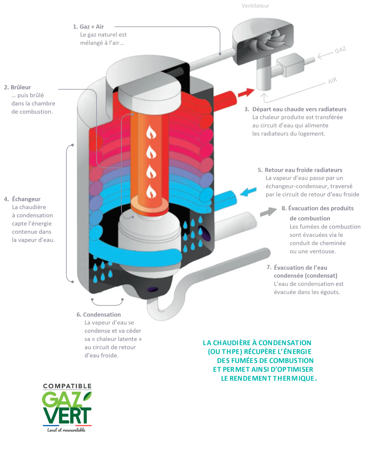 Schéma de fonctionnement d’une chaudière à condensation © GRDF