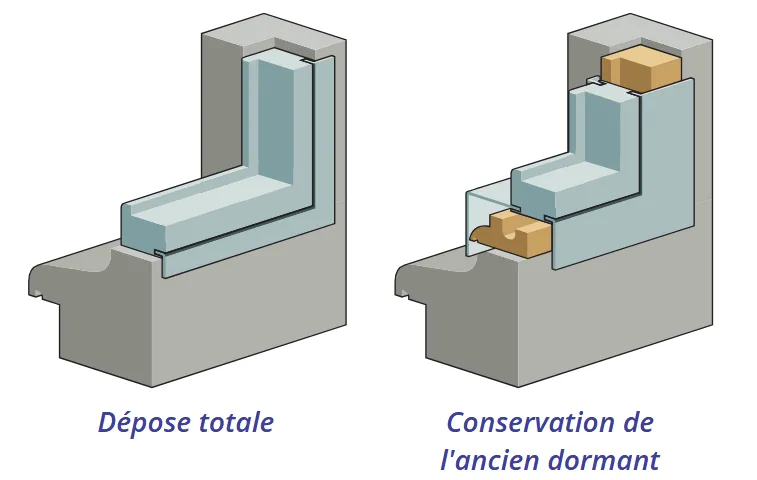 Le propriétaire peut choisir une pose « en rénovation » : l’ancienne fenêtre est démontée en conservant l'ancien dormant (la partie fixe autour de la fenêtre), et le nouveau dormant est installé par-dessus. Cette méthode a l’avantage d’être économique car il n’y a pas ou peu de reprises à faire sur le mur autour de la fenêtre. L'inconvénient est que la nouvelle fenêtre est forcément plus petite et fait perdre de la luminosité, en particulier sur les fenêtres de petites dimensions.