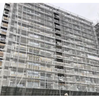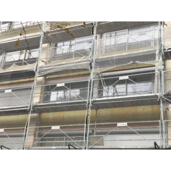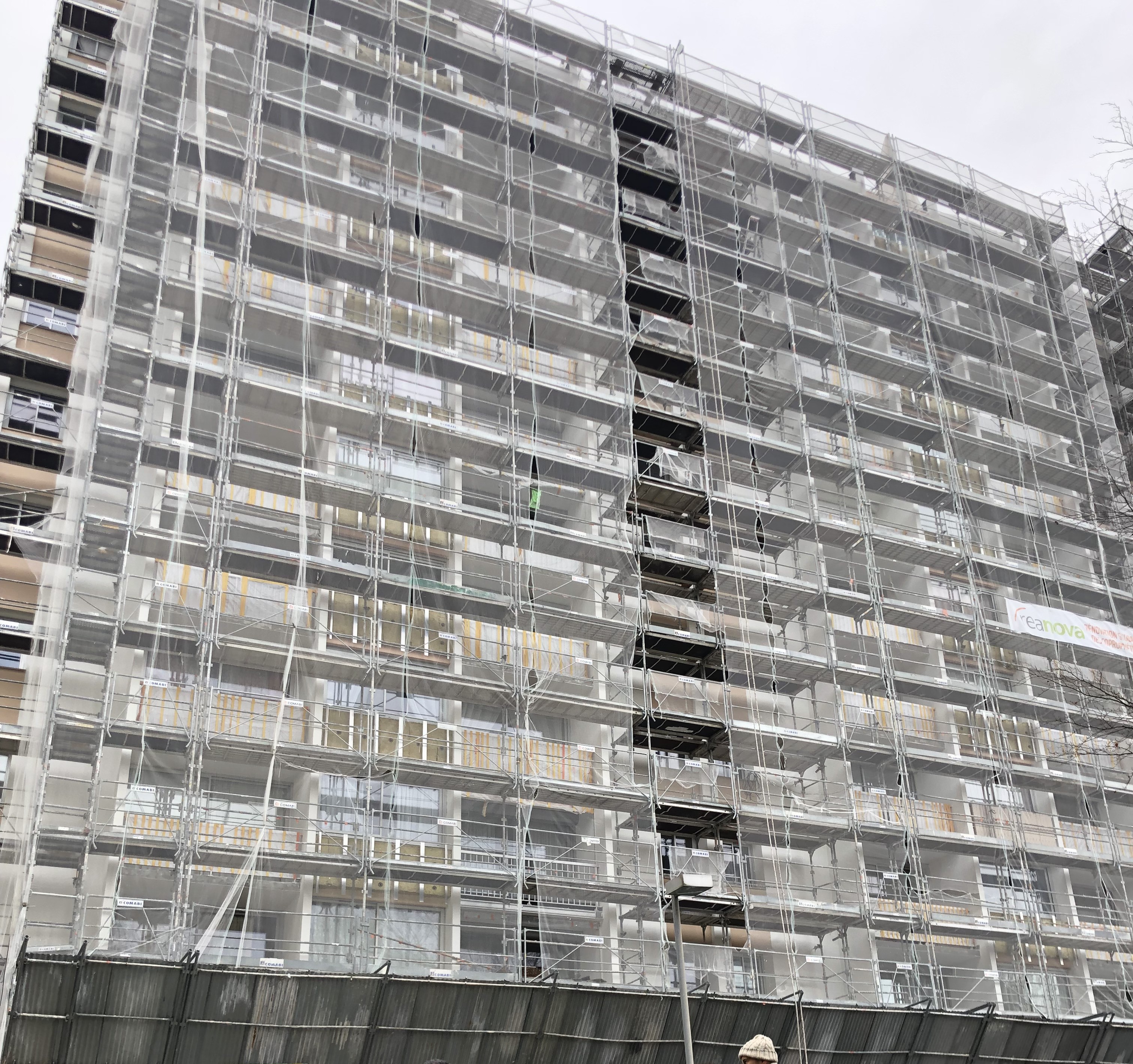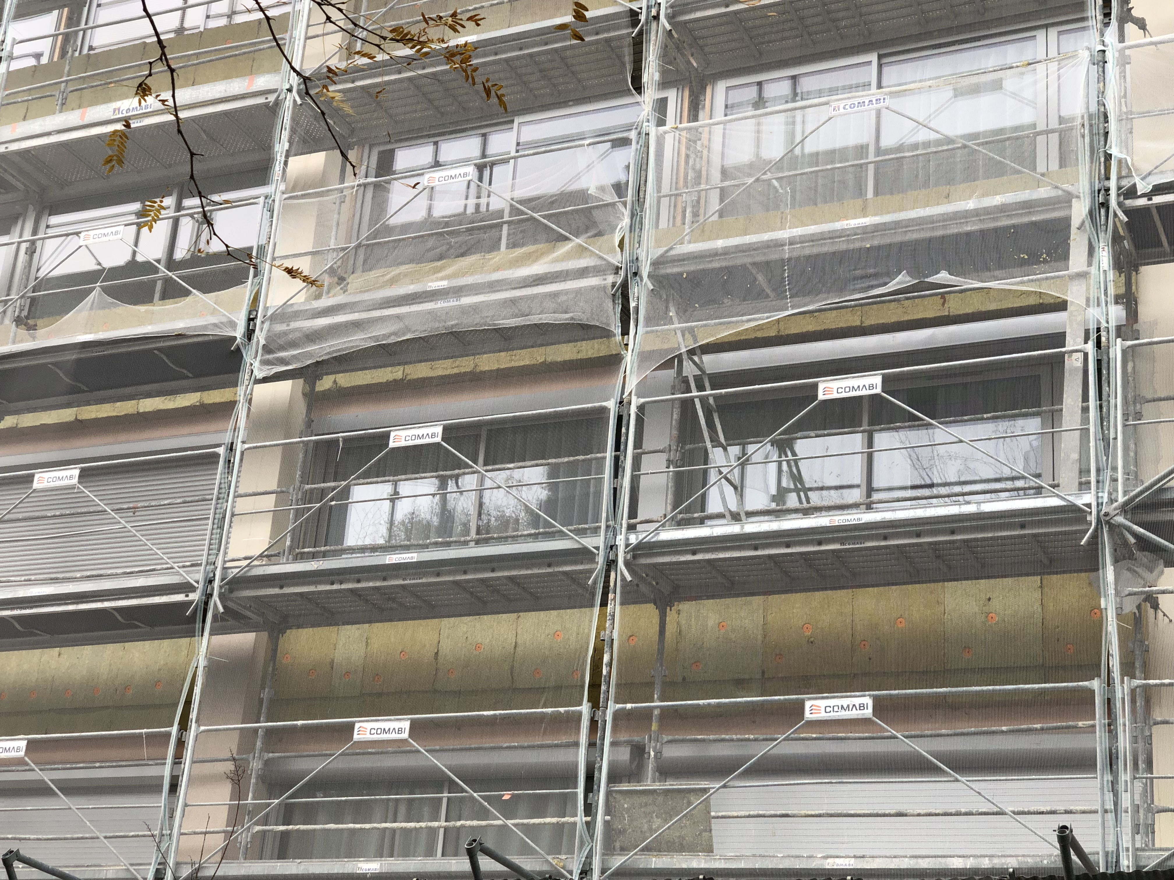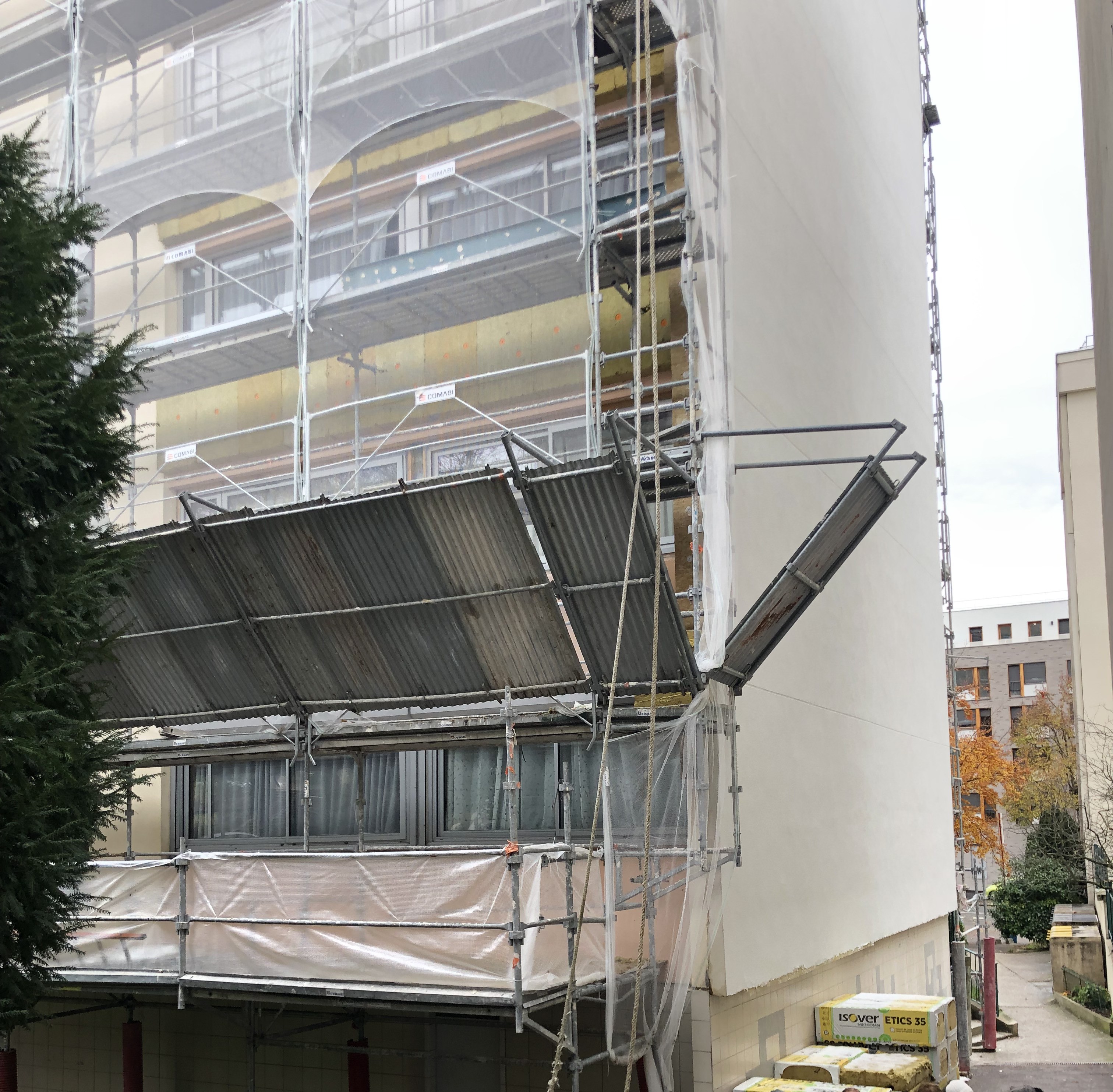 Ravalement et isolation de l'enveloppe : l'isolation des façades par l'extérieur avec traitement des ponts thermiques, l'isolation des planchers bas par soufflage de laine minérale au niveau des caves, l'isolation de la toiture terrasse, le remplacement des menuiseries collectives et de l'intégralité des menuiseries privatives d'origine de la résidence par des menuiseries en aluminium avec rupture de ponts thermiques, la dépose des protections solaires existantes et la mise en place de volets roulants, ont constitué l'essentiel des améliorations proposées sur l'enveloppe des bâtiments.