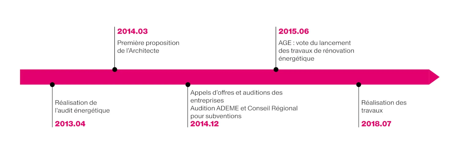 Un audit global (comprenant un volet énergétique et un volet architectural) a été réalisé à la demande de la copropriété avec pour objectif d'amener la performance énergétique à un niveau très ambitieux tout en revalorisant l'image de l'immeuble en conservant l'intention architecturale de départ. La rénovation énergétique est donc l’occasion d’une réelle revalorisation architecturale, les matériaux et couleurs de la nouvelle façade constituant une nouvelle image, ce qui était une forte demande des copropriétaire.