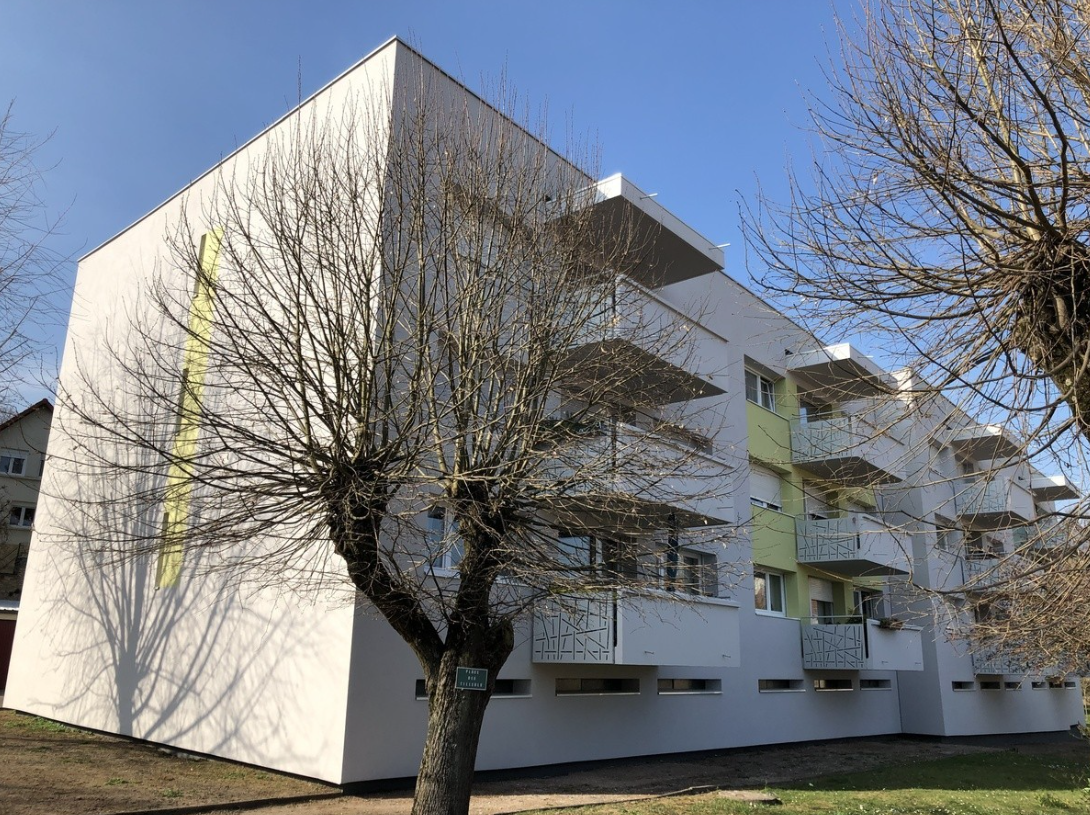 Pour chaque façade et par entrée d’immeuble, un grand carré d’enduit coloré a été réalisé, de manière à renforcer l’identité de chaque entrée tout en donnant du caractère à ces nouvelles façades lisses en procédant à un changement d’échelle. Les fenêtres sont regroupées par blocs distincts et sur les trois niveaux habités. Chaque appartement bénéficie ainsi d’un ensemble de fenêtres intégré dans l’un de ces grands carrés (à l’avant ou à l’arrière).