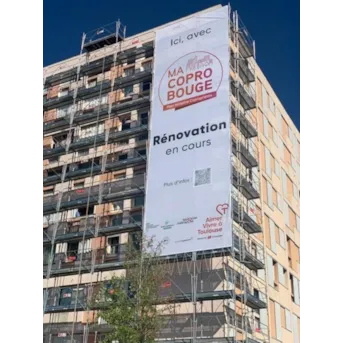 Pour sensibiliser les passants à la rénovation de cette résidence, un grand affichage a été mise en place sur l'échafaudage.