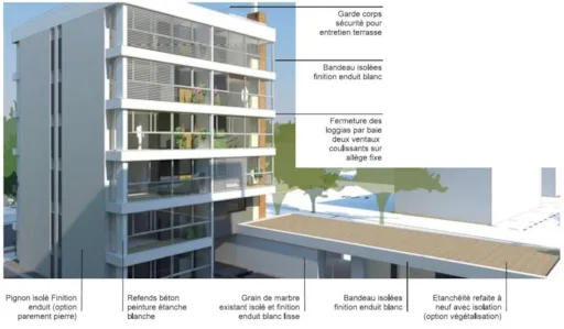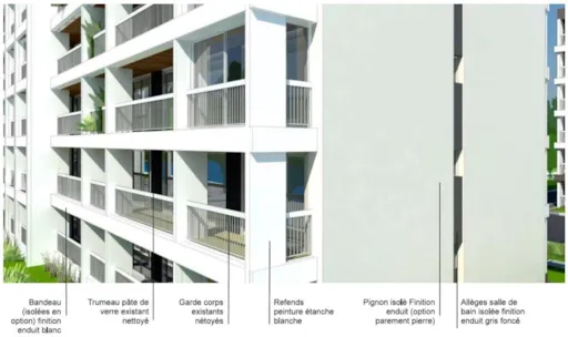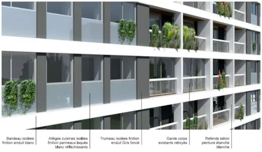 Cette opération ambitieuse portant sur les bâtiments A et B1 comprend le ravalement de toutes les façades avec isolation thermique par l'extérieur, le remplacement des menuiseries extérieures (privatives et lanterneaux de désenfumage), l'isolation des toitures-terrasses, des planchers bas sur parkings et des coffres de volets roulants, la mise en place d'une VMC hygro B, la pose de robinets thermostatiques sur les radiateurs, le rafraichissement des halls et leur mise en accessibilité PMR par des rampes paysagères extérieures.
