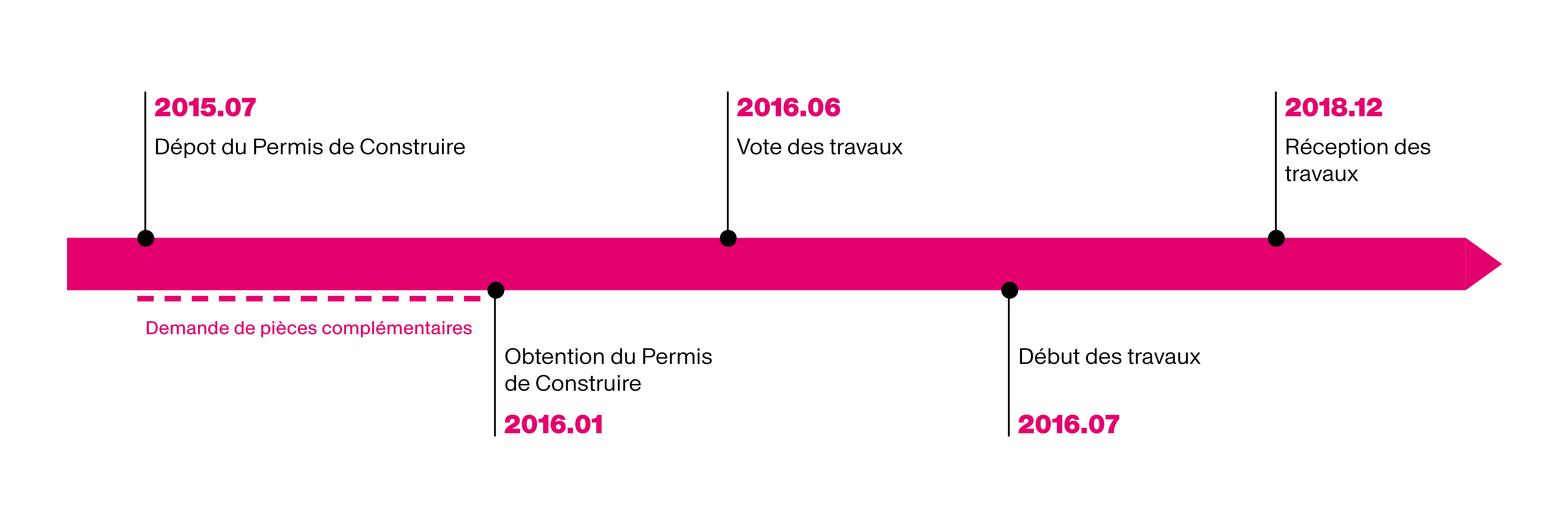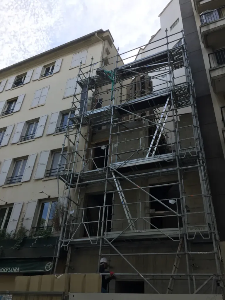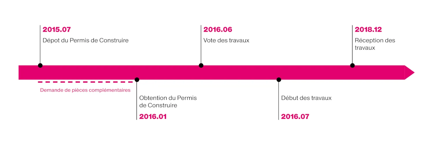 Fin juin 2018, les travaux de gros œuvre, de création de l'ascenseur, de surélévation et de ravalement étaient achevés. Restaient la réfection du second étage (opération à tiroir en site occupé), la résorption d'un problème d’infiltrations d’eau au 6ème entre la dalle béton et la chape de finition, la finalisation de l'installation de la pompe à chaleur desservant les nouveaux étages (6 et 7èmes) et la mise en peinture.