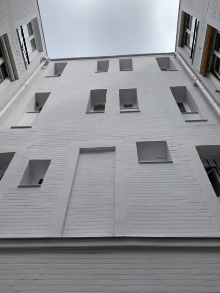 En 2023, la copropriété sélectionne son maître d’œuvre Dragomira GEORGIEVA Architecte qui réalise une mission de conception sur la base des conclusions de l’audit thermique en prenant compte l’enveloppe financière votée par la copropriété. L’architecte établit une DP accordée en septembre 2023. L’entreprise générale de travaux SMB certifiée RGE été retenue pour réaliser les travaux. La copropriété vote un budget complémentaire afin d’intégrer au programme travaux la rénovation complète de la couverture et ainsi optimiser la présence d’un échafaudage.