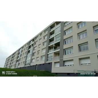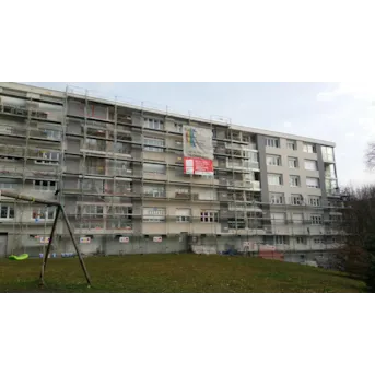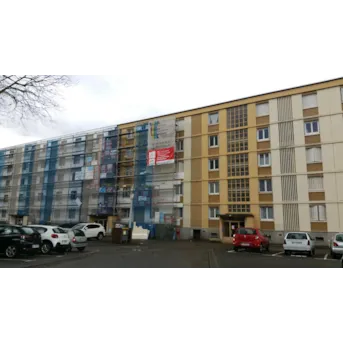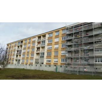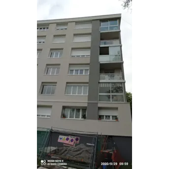 brique plâtrée ---------------------------------------------------- TRAVAUX DE RÉNOVATION : Traitement éclats de béton, épaufrures et fissures. Isolation thermique extérieure : 160 mm polystyrène sous enduit minéral, R = 4 m².K/W. Pas d’isolation des retours en tableau des ouvertures